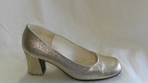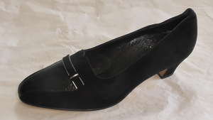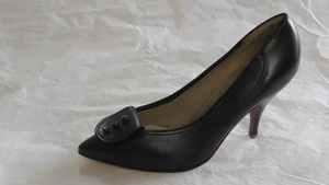 Schwarzer Pumps mit drei Zierknöpfen auf einer Lasche
