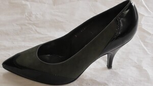 Grau-schwarzer Pumps aus Velours- und Lackleder mit Zierlochungen