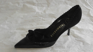 Schwarzer Pumps aus Velours- und Lackleder mit Zierschleife aus Satin