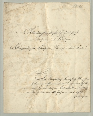 Zum Jubiläum des Königlichen Schlosses: die an I.M. die Kaiserin und Königin anlässlich der 100. Wiederkehr des Jahrestages der feierlichen Einrichtung des Schlosses gerichtete Adresse des Oberbürgermeisters, der Beigeordneten und Stadtverordneten von Coblenz