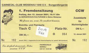 Eintrittskarte Carneval Club Weisenau - Die Burggrafen - 2001 - 1. Fremdensitzung (3x)