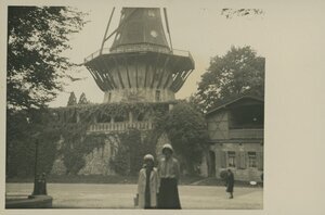 Porträt einer Dame und eines Mädchens vor einer Historischen Mühle