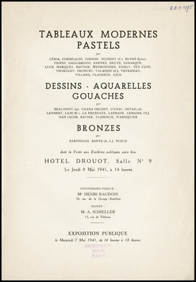 Tableaux modernes, pastels : par Céria, Corbellini, Cosson, Dumont (P.), Dupré (Jules) [und weiteren] : dessins, aquarelles, gouaches : par Beaumont (de), Chana Orloff, Ciceri, Detaille [und weiteren] : bronzes : par Bartholdi, Barye (A.L.), Puech : dont la vente aux enchères publiques aura lieu Hôtel Drouot, Salle No 9, le jeudi 8 mai 1941 / commissaire-priseur: Henri Baudoin ; expert A. Schœller