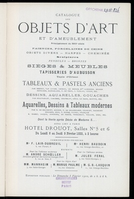 Catalogue des objets d'art et d'ameublement : principalement du XVIIIe siècle : faïences, porcelaines de Chine : objets divers, harpes, cheminée : sculptures : pendules, bronzes : sièges & meubles : tapisseries d'Aubusson : tapis d'Orient : tableaux & pastels anciens : par Brenet, van Goyen [und weiteren] : dessins, aquarelles, gouaches : par Beauvarlet, Caresme [und weiteren] : aquarelles, dessins & tableaux modernes : par E. de Beaumont, Boudin [und weiteren] : dont la vente après décès de Madame S... : aura lieu à Paris, Hôtel Drouot, Salles Nos 5 et 6, du lundi 6 au jeudi 9 février 1922 / commissaires-priseurs F. Lair Dubreuil, Henri Baudoin ; experts pour les tableaux modernes André Schœller, pour les tableaux anciens Jules Féral, pour les objets d'art M. Mannheim, Marius Paulme et G. B.-Lasquin