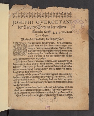Josephi Quercetani. M.D. Pharmacopoea Restituta. Das ist. Verbesserte Apoteckerku[n]st oder zubereittung aller Medicame[n]ten, nach Chÿmischer art und manier / von weÿland ... H. Josepho Quercetano ... in Französisch und Lateinischer Sprach an tag geben. Nun aber mit etlicher ort erleüterung und anderer schöner bewerter mittlen anhänge in daß Teutsch versetzet. Durch Johan Adolph Ringelstein M.D.