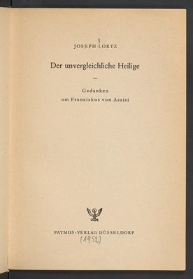 Der unvergleichliche Heilige : Gedanken um Franziskus von Assisi / Joseph Lortz