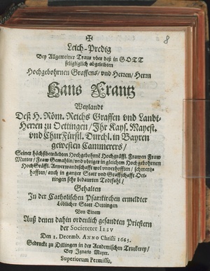 Leich-Predig Bey Allgemeiner Traur vber deß in GOTT seligliglich abgeleibten Hochgebohrnen Graffens/ vnd Herren/ Herrn Hans Frantz Weylandt deß H. Röm. Reichs Graffen vnd Landtherren zu Oettingen ... : Seiner höchstbetrüebten Hochgebohrne Hochgräffl. Frawen Fraw Mutter/ Fraw Gemahlin/ ... wol vnverhofften/ Schemrzhafften/ auch in gantzer Statt vnd Graffschafft Oettingen sehr bedaurten Todtfahl/ Gehalten In der Catholischen Pfarrkirchen ermeldter Löblicher Statt Oettingen Von Einem Auß denen dahin ordentlich gesandten Priestern der Societet Iesv Den 1. Decemb. Anno Christi 1665