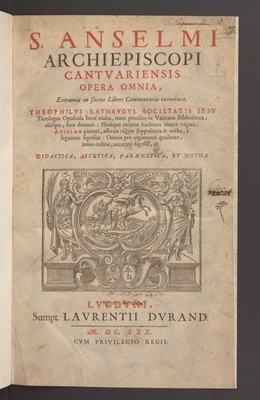 S. Anselmi Archiepiscopi Cantvariensis Opera Omnia, Extraneis in sacros Libros Commentariis exonerata : Theophilvs Raynavdvs Societatis Iesv Theologus Opuscula benè multa, nunc primùm ex Vaticana Bibliotheca, aliísque, luce donauit ... Omnia pro argumenti qualitate, nouo ordine, accuratè digessit, in Didactica, Ascetica, Parænetica, Et Notha.