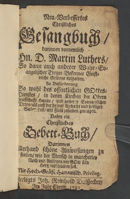 Neu-Verbessertes Christliches Gesangbuch : darinnen vornemlich Hn. D. Martin Luthers, So dann auch anderer Wahr-Evangelischer Treuer Bekenner Geistreiche Gesänge enthalten. Zu Beförderung So wohl des offentlichen Gottes-Dienstes, in denen Kirchen der Obern Graffschafft Hanau, und anderer Evangelischer Orten, als auch der Privat-Andacht und heiliger Seelen Lust, mit Fleiß zusamen getragen