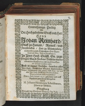 Einweihungs-Predig Als der Hochgebohrne Graff und Herr Herr Johan Reinhard/ Graff zu Hanaw/ Rieneck/ vnd Zweybrücken ... In Ihrer Hoch-Gräffl. Gn. zugehörigen Marck-Fleckens Willstätt wieder erbaweten Kirchen das erste mahl den Gottes-Dienst verrichten laßen/ ... : Auch in eigener Persoh/ beneben aller Ihro Hoch-Gräfflichen Gnaden Amtsleuten ... Den 15. Juli Anno 1657. gehalten vnd auff begehren zum Truck übergeben / Durch Johann Heinricum Schubbaeum, Pfarrer zu Willstätt