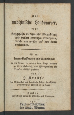 Der medizinische Landpfarrer, oder kurzgefaßte medizinische Abhandlung und Heilart derjenigen Krankheiten, welche am meisten auf Lande vorkommen : Allen Herrn Seelsorgern und Wundärzten in den Orten, in welchen keine Ärzte wohnen, zu ihrem Gebrauch, und Wiedergenesung der Kranken redlich gewidmet / von J. Krause, der Weltweisheit und Arzneikunde Doktor, kurpfälzischer Oberamtsarzt zu Neustadt an der Haard.