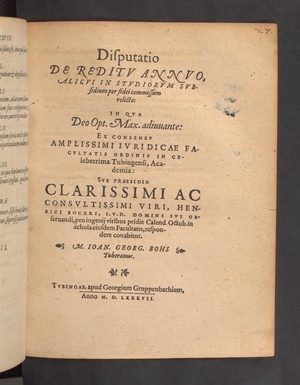 Disputatio DE REDITV ANNVO, ALICVI IN STVDIORVM SVBsidium per fidei commissum relicto: IN QVA Deo Opt. Max. adiuuante: EX CONSENSV AMPLISSIMI IVRIDICAE FACVLTATIS ORDINIS IN CEleberrima Tubingensi, Academia: SVB PRAESIDIO ... HENRICI BOCERI, I.V.D ... pro ingenij viribus pridie Calend. Octob. in Schola eiusdem Facultatis, respondere conabitur, M. IOAN. GEORG. BOHS Tuberanus.