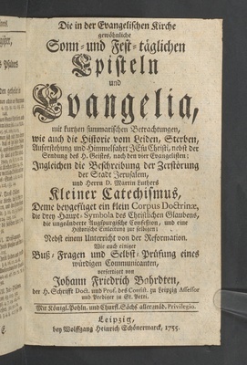 Die in der Evangelischen Kirche gewöhnliche Sonn- und Fest-täglichen Episteln und Evangelia : mit kurtzen summarischen Betrachtungen, wie auch die Historie vom Leiden, Sterben, Auferstehung und Himmelfahrt Jesu Christi, nebst der Sendung des H. Geistes, nach den vier Evangelisten; Ingleichen die Beschreibung der Zerstörung der Stadt Jerusalem, und Herrn D. Martin Luthers Kleiner Catechismus, Deme beygefüget ein klein Corpus Doctrinæ, die drey Haupt-Symbola des Christlichen Glaubens, die ungeänderte Augspurgische Confeßion, und eine Historische Einleitung zur selbigen; Nebst einem Unterricht von der Reformation. Wie auch einiger Buß-Fragen und Selbst-Prüfung eines würdigen Communicanten, / verfertiget von Johann Friedrich Bahrdten, Der H. Schrifft Doct. und Prof. des Consist. zu Leipzig Asessor und Prediger zu St. Petri.