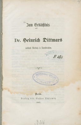 Zum Gedächtnis Dr. Heinrich Dittmars weiland Rectors in Zweibrücken / [A.F. Butters]