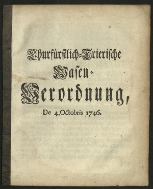 Churfürstlich-Trierische Wasen-Verordnung, de 4. Octobris 1746 / [Franz Georg, Kurfürst. Ex Mandato in Absentia Secretarii H. F. v. Gaertz]