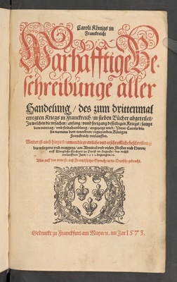 Caroli Königs in Franckreich Warhafftige Beschreibunge aller Handelung des zum drittenmal erregten Kriegs in Franckreich : in sieben Bücher abgetheilet ... Weiter ist auch hinzu kommen die grewliche und erschreckliche beschreibung des würgens und metzgens am Admiral und vielen Fürsten und Herrn auff königliche Hochzeit zu Pariß im Augusto ... 1572 begangen etc. / [Mutmaßl. Verf.: Jean de Serres]