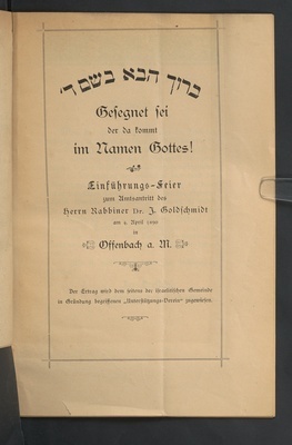 Baruch Haba beshsem dalet : Gesegnet sei der da kommt im Namen Gottes! : Einführungs-Feier zum Amtsantritt des Herrn Rabbiner Dr. I. Goldschmidt am 4. April 1890 in Offenbach a. M.