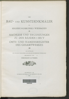 Die Bau- und Kunstdenkmäler des Regierungsbezirks Wiesbaden - Nachlese und Ergänzungen zu den Bänden I bis V : Orts- und Namensregister des Gesamtwerkes / bearb. von Ferdinand Luthmer / hrsg. vom Bezirksverband des Regierungsbezirks Wiesbaden