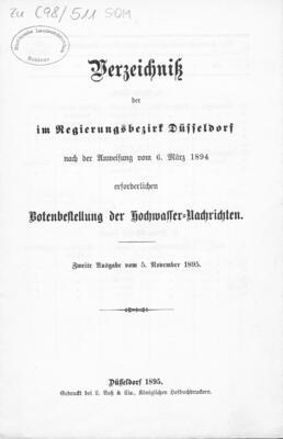 Verzeichniß der im Regierungsbezirk Düsseldorf nach der Anweisung vom 6. März 1894 erforderlichen Botenbestellung der Hochwasser-Nachrichten