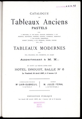 Catalogue de tableaux anciens : pastels : par J. Breughel, H. van Balen, Cranach, Desportes, J. Fyt [und weiteren] : tableaux modernes par Eug. Delacroix, Eug. Fromentin, Ch. Jacque : appartenant à M. X... : et dont la vente aura lieu Hôtel Drouot, Salle No 6, le vendredi 26 avril 1907 / commissaire-priseur Lair Dubreuil ; expert Jules Féral